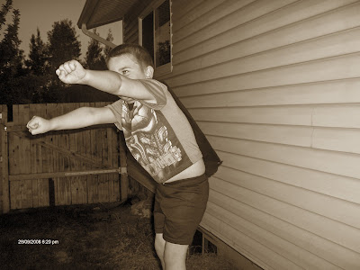 Tyler had his 2nd soccer game on Tuesday, and I forgot to pull the camera out until they were shaking hands--at least we got something right? I SO appreciate eveyones advice on helping him want to play--the bribes are working, somewhat. He comes over and sits down by me a lot, and says "I quit!" but I can coax him to get back out there. It's hard because there is one boy, the coaches son, who kicks the ball away from everyone and runs down and scores everytime. It's a little frustrating for the other boys--Tyler keeps saying he is never going to win, which he thinks is scoring a goal. I keep telling him it's about having fun, but he is not convinced. Don't get me wrong, I am glad at least one of the boys knows what he is doing, but it is hard when the other ones hardly get to touch the ball. Tyler is hilarious to watch, because he is not paying attention to where the ball is at all. There was a couple of times where he was busy goofing around, and the ball was right next to him! We were all over on the sideline yelling at him to kick it, and by the time he looked around for it, it was gone! At this point I am just happy he was on the field. I am hoping it will come with a little more time. His next game is Saturday--at 8 AM!! And pictures are before that--at 7:30! Holy Cow--we're not functioning at our house that early! We'll make it though, somehow.